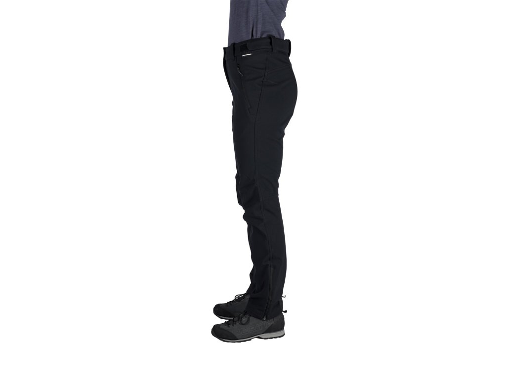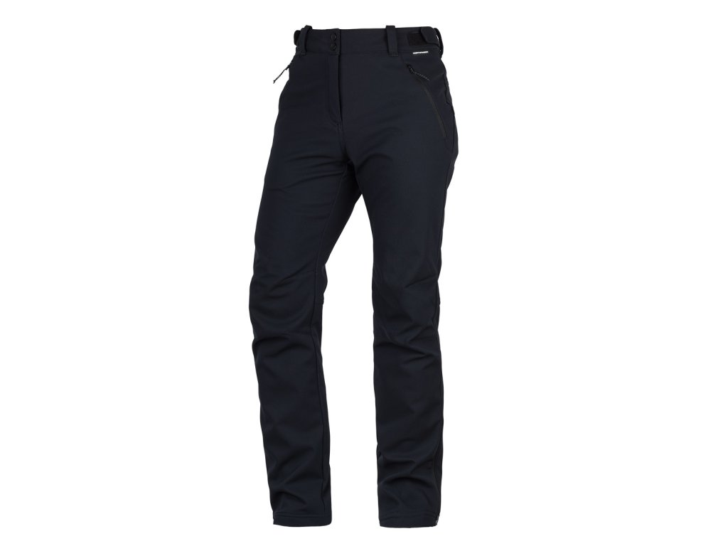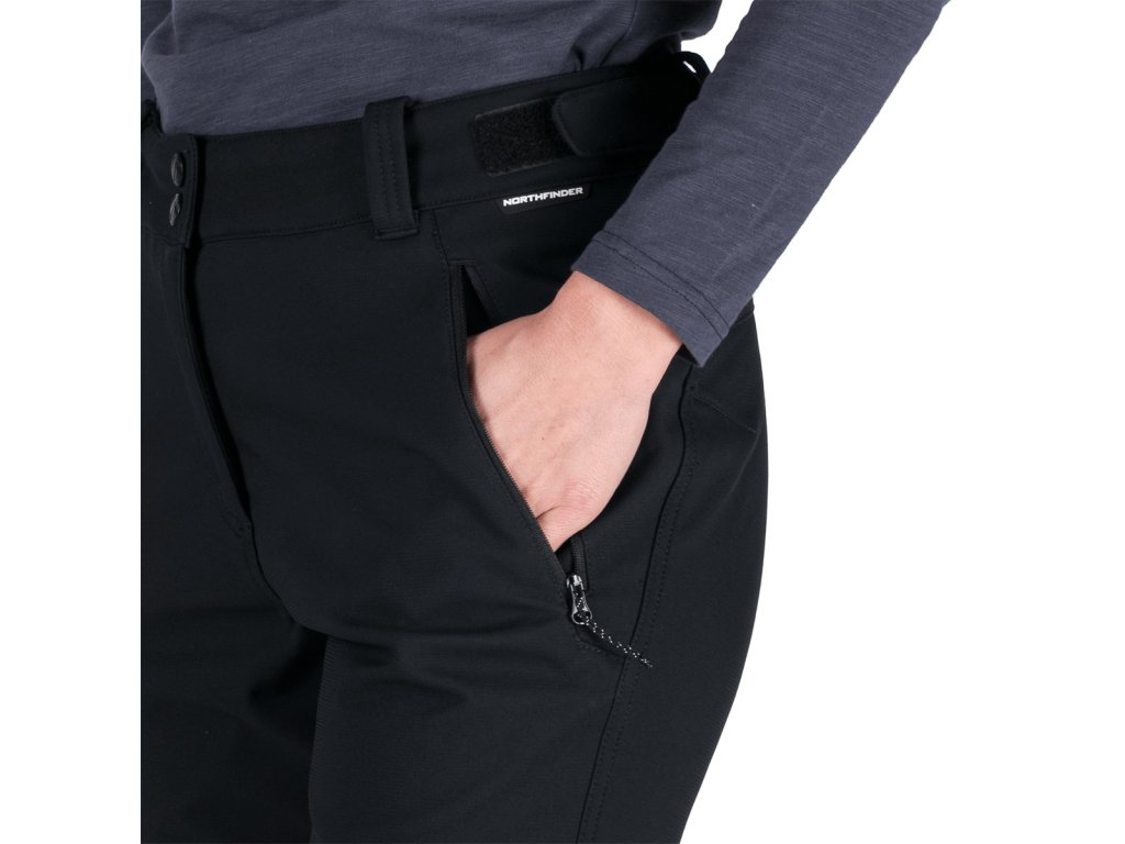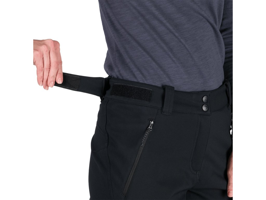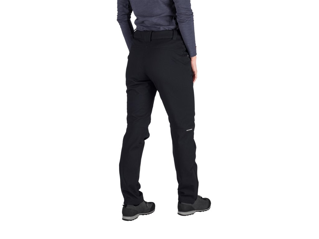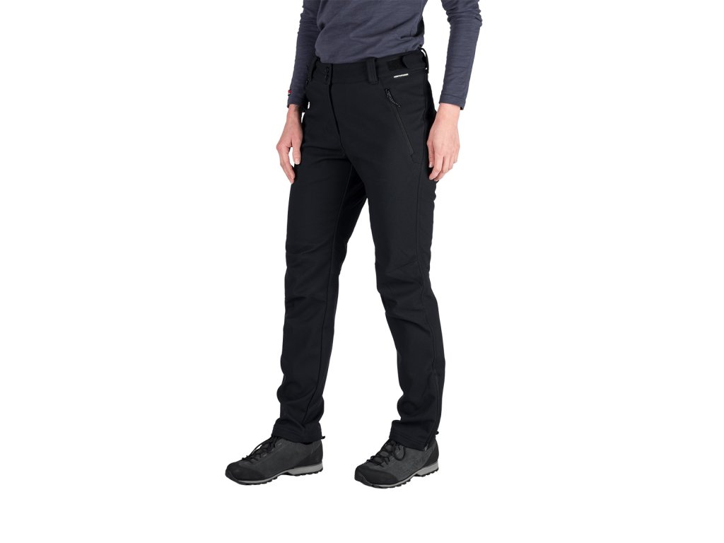 Dámske nohavice z 3-vrstvového softshellu s parametrami vodoodolnosti a priedušnosti 10 000 mm H₂O / 10 000 g/m²/24 h, ktorý ochráni pred vetrom a dažďom, a vďaka počesanej vnútornej strane zahreje aj v chladnom počasí. Predtvarované kolená poskytnú pohodlie pri pohybe. Disponujú nastaviteľným pásikom v páse a dolným krajom, ktorý je možné stiahnuť podľa potreby. Vpredu s dvoma praktickými vreckami na zips. Nohavice sú opatrené ekologickou vodoodolnou DWR úpravou bez použitia PFC látok.