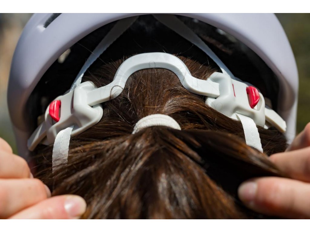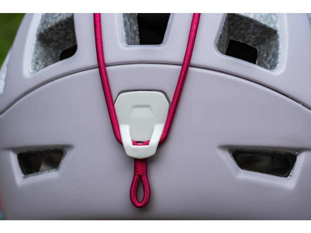 - Tenká pracka na podbradnom pásiku sa zaistí na mieste, aby sa neposúvala a nedošlo k nechcenému uvoľneniu popruhu
