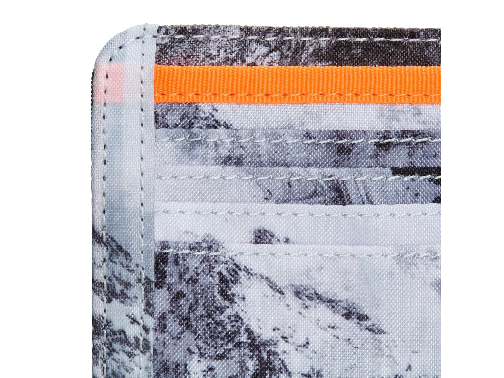 Peňaženka je vyrobená z nylonu, ktorý zaručuje vysokú odolnosť proti mechanickému poškodeniu. DWR úprava bez PFC chráni obsah pred vlhkosťou. Vnútro peňaženky obsahuje šesť priehradiek na karty, vrecko na mince so zipsom a priehradku na bankovky. Celá peňaženka sa bezpečne uzatvára na patentku.