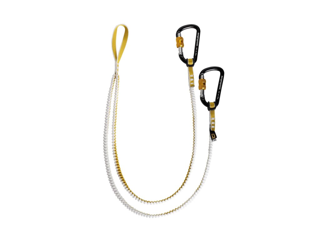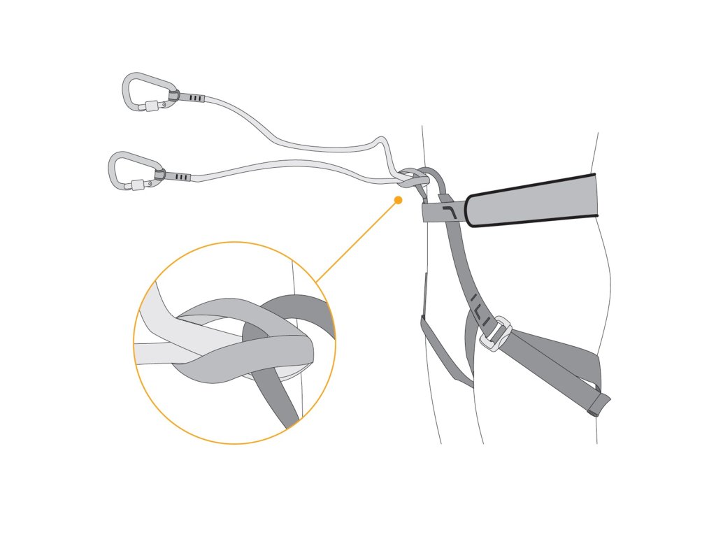 Ľahká pružná slučka s dvoma ramenami a malými karabínami na pripojenie cepínov k sedaciemu úväzku.