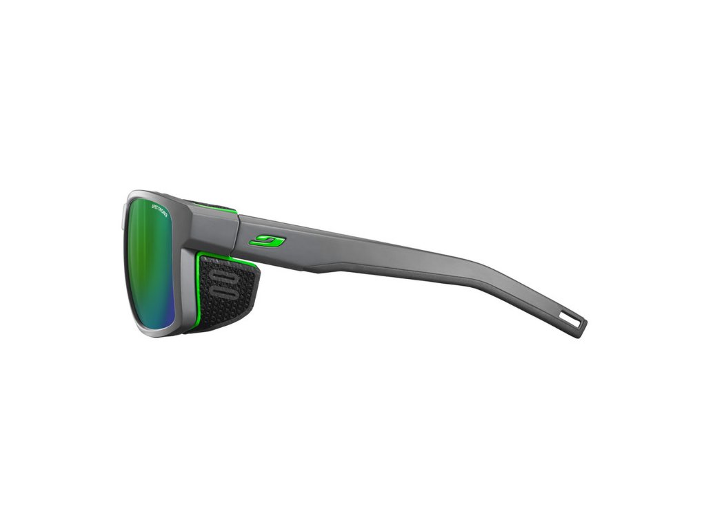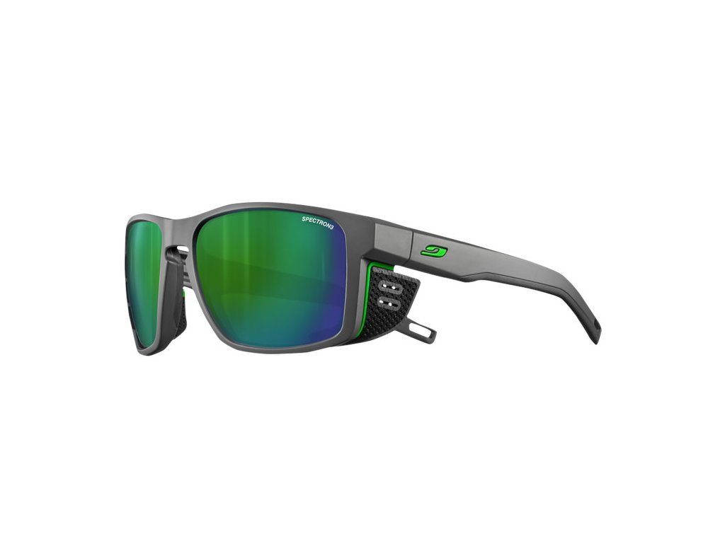 Okuliare Julbo Shield patria medzi modely špeciálne určené do vysokých hôr a extrémnych podmienok. Bočnice sú vyrobené z mäkkej tkaniny tak, aby nedráždili mrazom namáhanú pokožku. Nosník opatrený pružnou vložkou tlmí nárazy a stránice s hladkou úpravou nezachytávajú vlasy. Slnečný filter kategórie 3 dostatočne ochráni vaše oči proti UV žiareniu aj proti oslneniu zo snehových plôch.