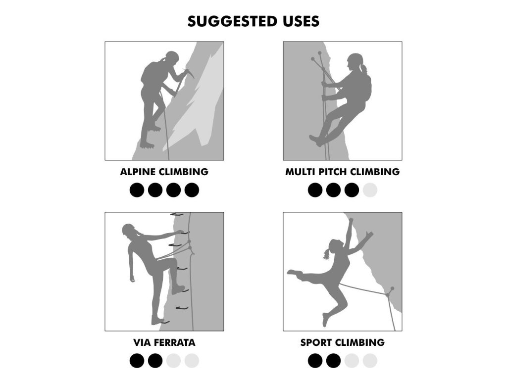 - vybavené štyrmi nastaviteľnými prackami z ľahkej zliatiny pre rýchle nastavenie a optimálne prispôsobenie sa telu pri rôznych aktivitách (horolezectvo, lezenie, lezenie po ľade atď.)